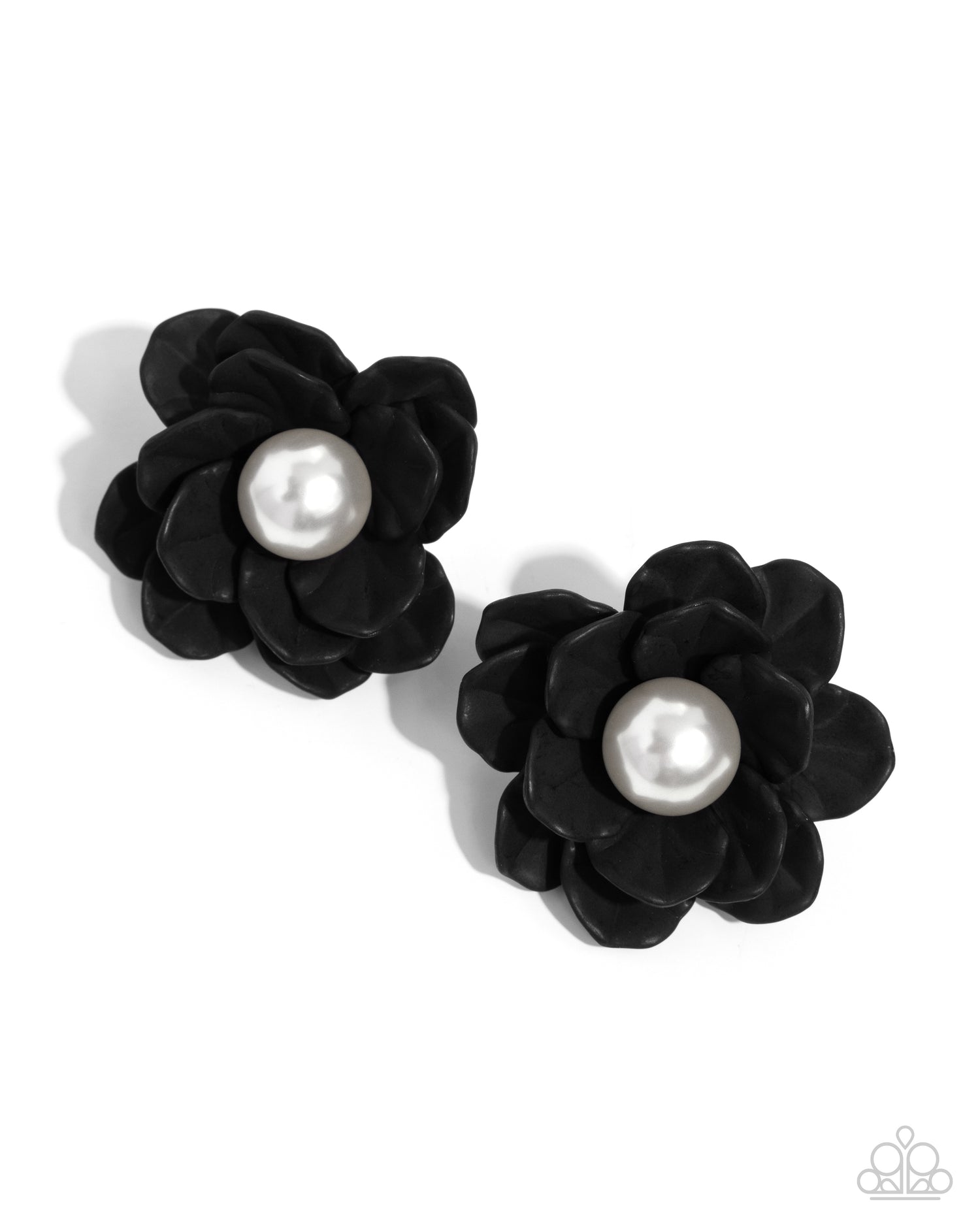 Black matte petals bloom around a glossy oversized white pearl center at the ear for a beautiful, blooming basic. Earring attaches to a standard post fitting.