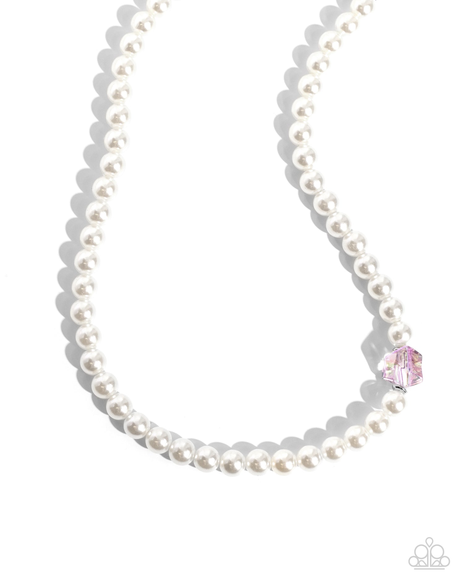 Infused along an invisible string, a collection of refined white pearls coalesces around the neckline. An abstract, cubed purple clear bead interrupts the pearls for a touch of feminine color. Features an adjustable clasp closure.