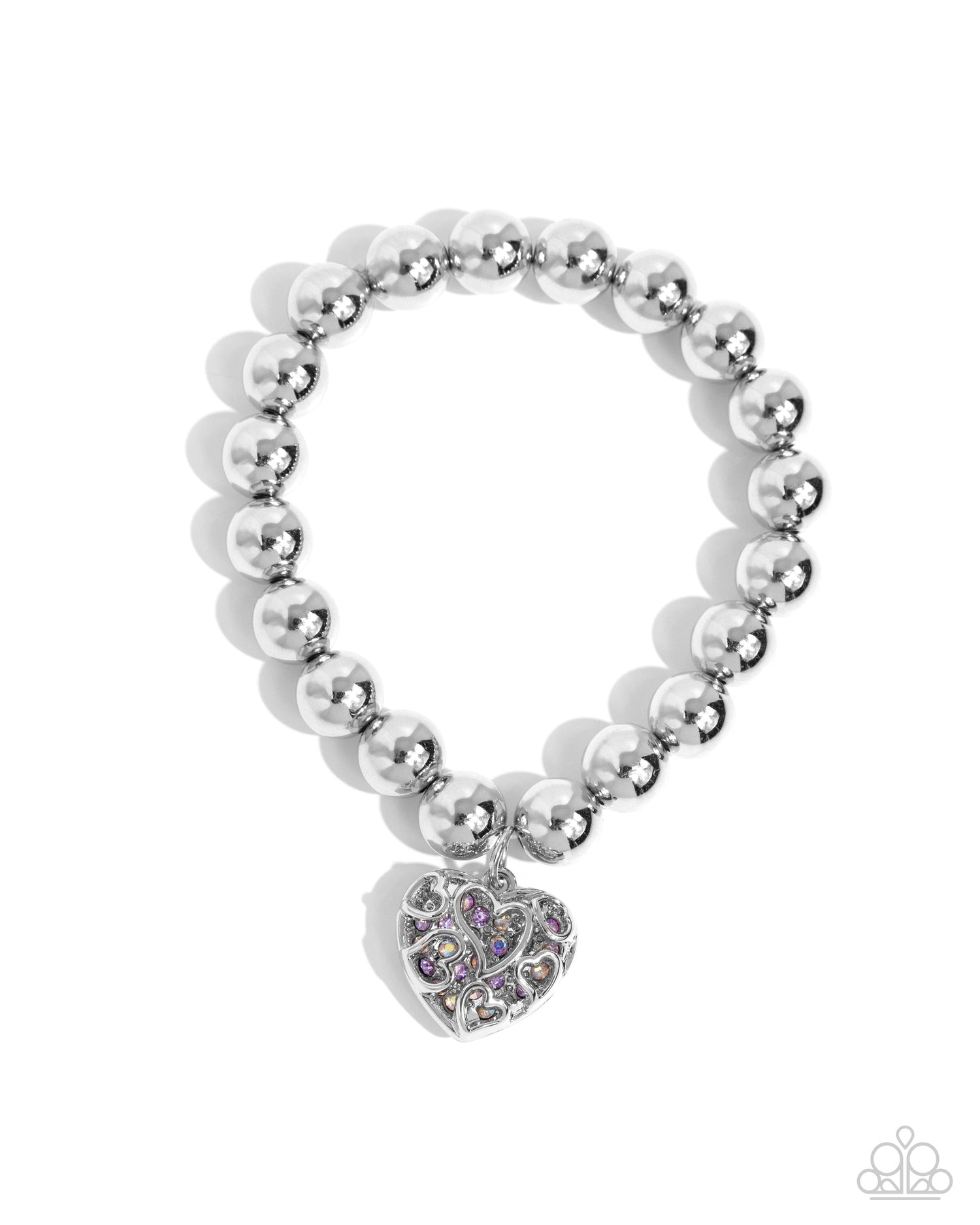 Infused along an elastic stretchy band, a collection of bold silver beads glimmer from the wrist. Violet, violet iridescent, iridescent rhinestones, and dainty silver studs peek out from underneath a silver heart filigree cover for a whimsical, romantic finish. Due to its prismatic palette, color may vary.