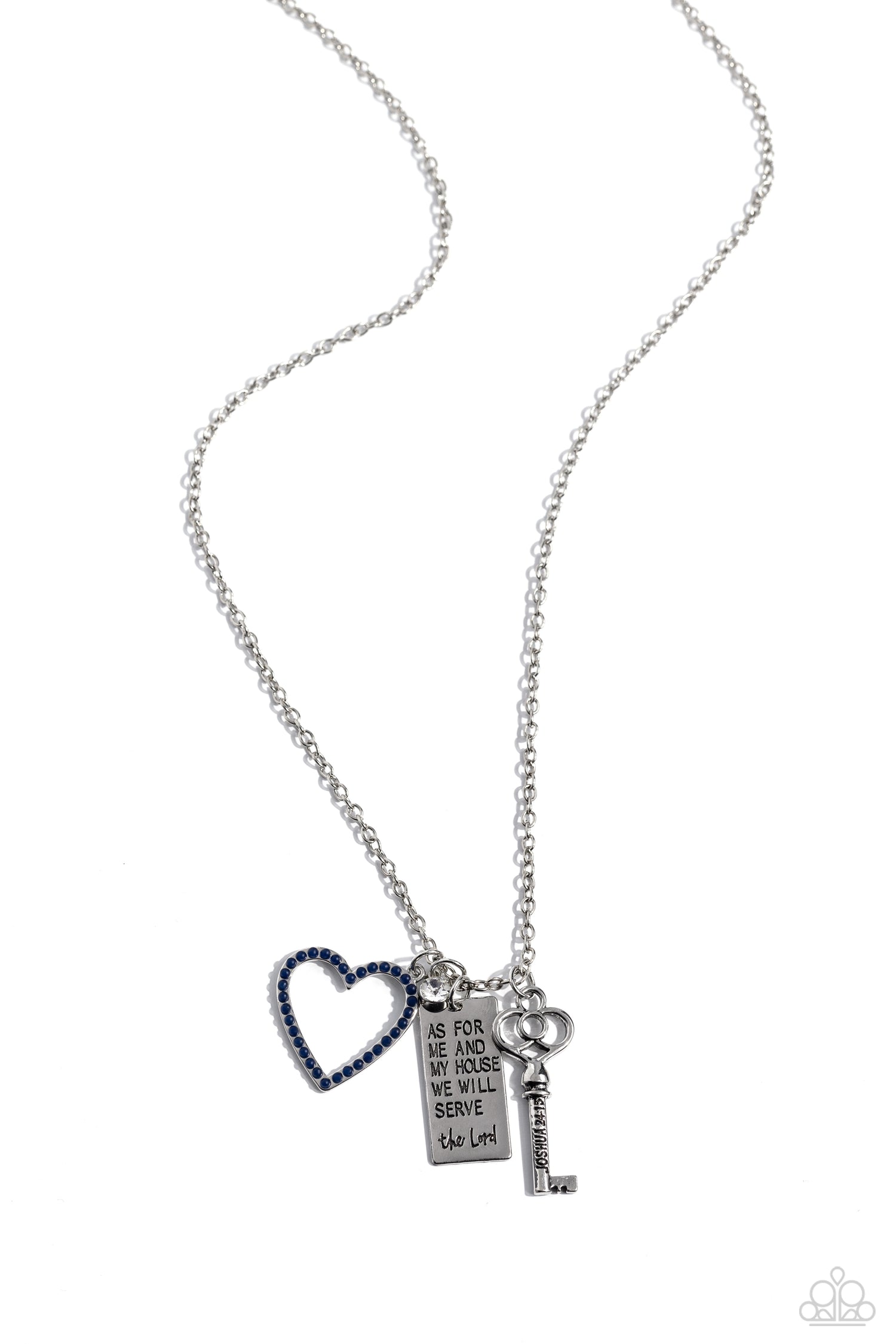 Dotted in dainty navy beads, an airy heart frame joins a silver rectangle stamped in the biblical passage, "As for me and my house we will serve the Lord," a dainty white gem, and an intricate silver key stamped in, "Joshua 24:15," along the bottom of a lengthened silver chain, creating an inspirational pendant. Features an adjustable clasp closure.