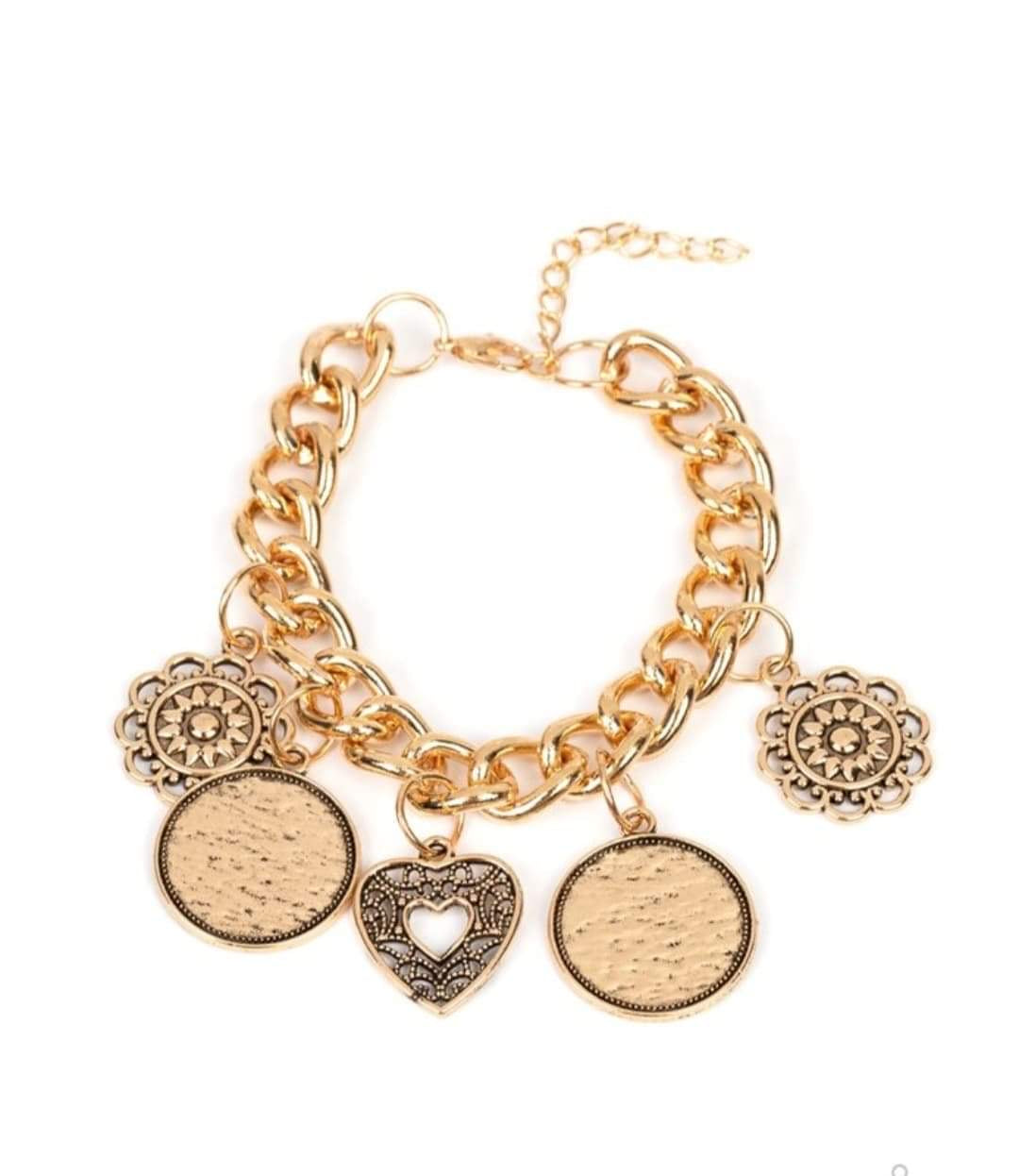A whimsical collection of gold charms — including an airy heart, flowers, and textured coin-like discs — dance from a chunky gold chain around the wrist, creating a boisterous fringe. Features an adjustable clasp closure.