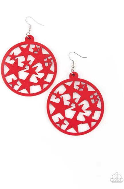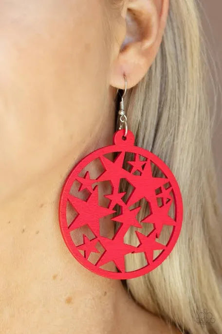 An oversized round red wooden frame is filled with a cosmos of cut-out red stars creating a whimsical statement. Earring attaches to a standard fishhook fitting.
