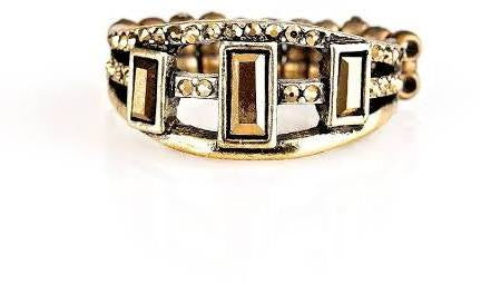 Three aurum emerald-cut rhinestones are encrusted along three brass bands radiating with smooth surfaces and sections of glittery aurum rhinestones for an edgy fashion. Features a stretchy band for a flexible fit.
