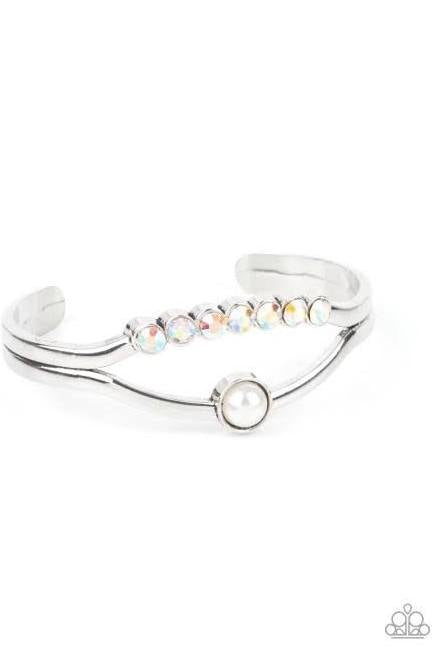 A row of iridescent rhinestones and a solitaire white pearl adorn the layered center of a classic silver cuff, creating a timeless piece around the wrist.