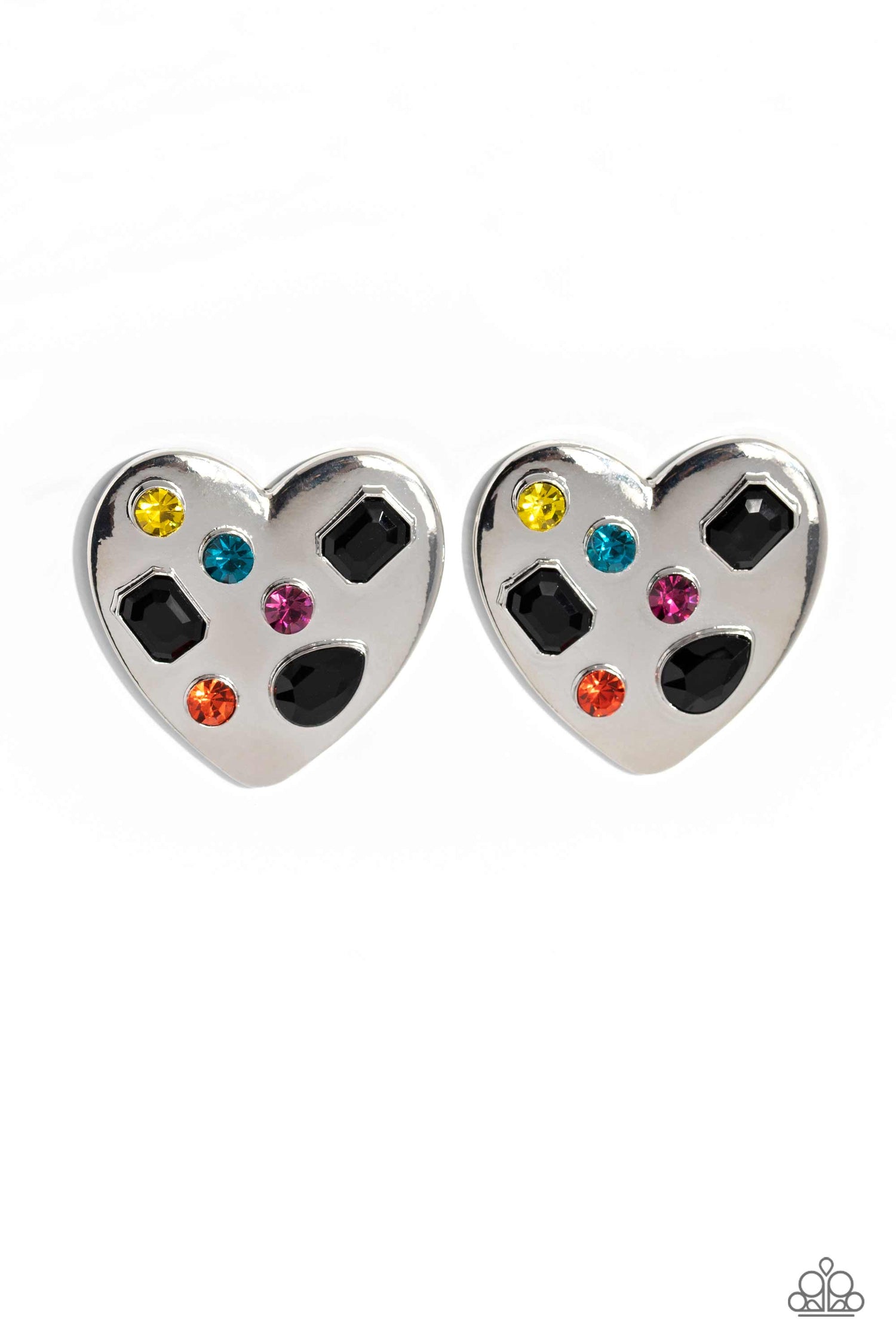 Brushed with shimmery pink, orange, yellow, blue, and black round, teardrop and emerald-cut gems, an oversized, high-sheen silver heart frame rests against the ear for a dazzling finish. Earring attaches to a standard post fitting.