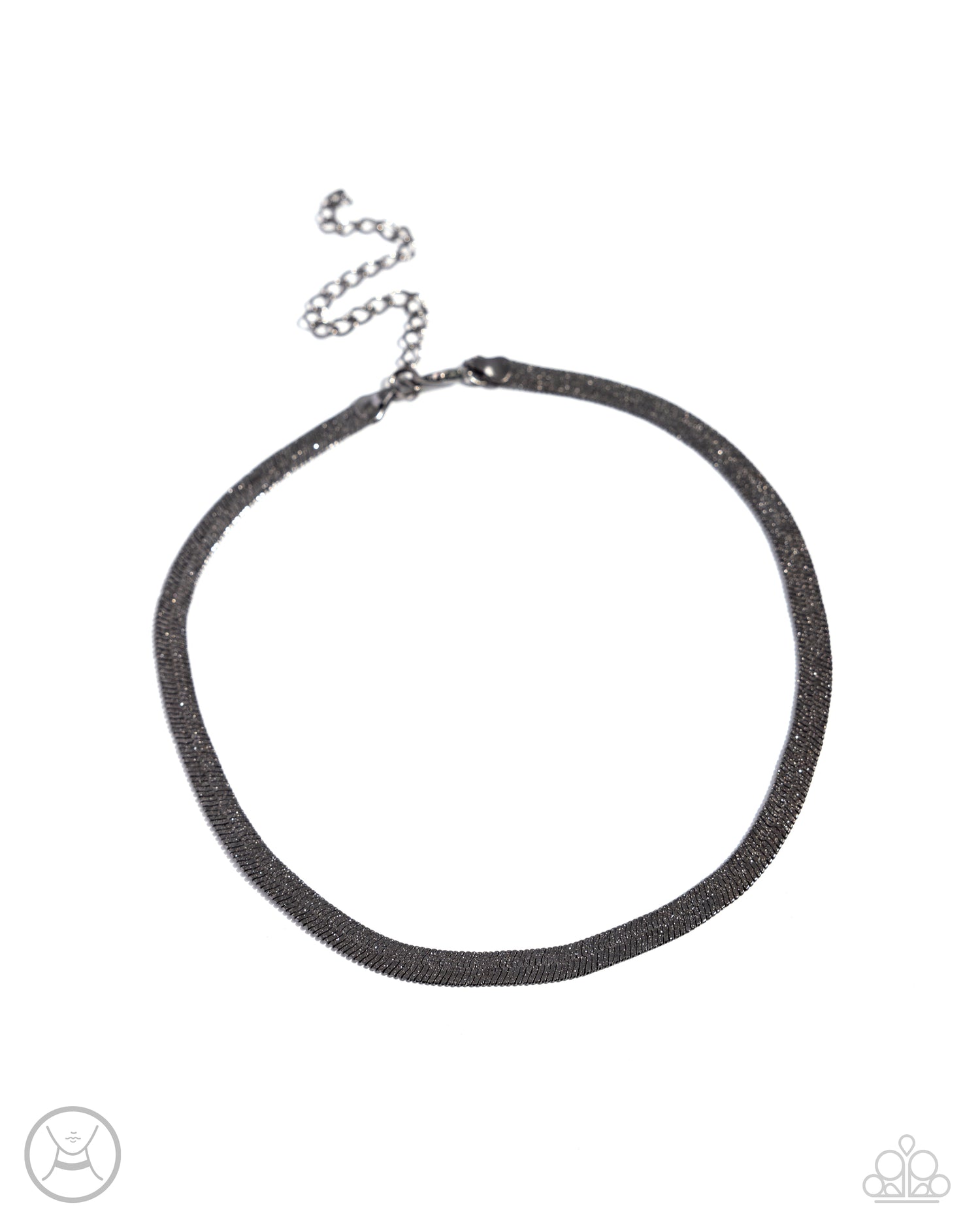 Dusted with dainty shimmer, a curved collection of high-sheen gunmetal flat chain connects around the collar for a simply shimmery statement. Features an adjustable clasp closure.